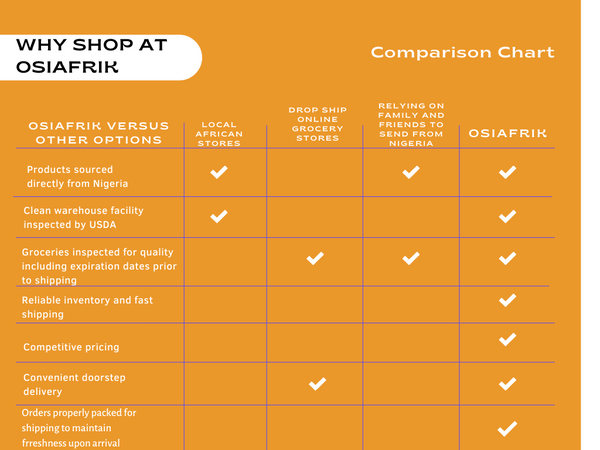 WE OFFER STAPLE NIGERIAN PRODUCTS FROM TRUSTED BRANDS TO HELP YOU PREPARE YOUR NIGERIAN CUISINE.